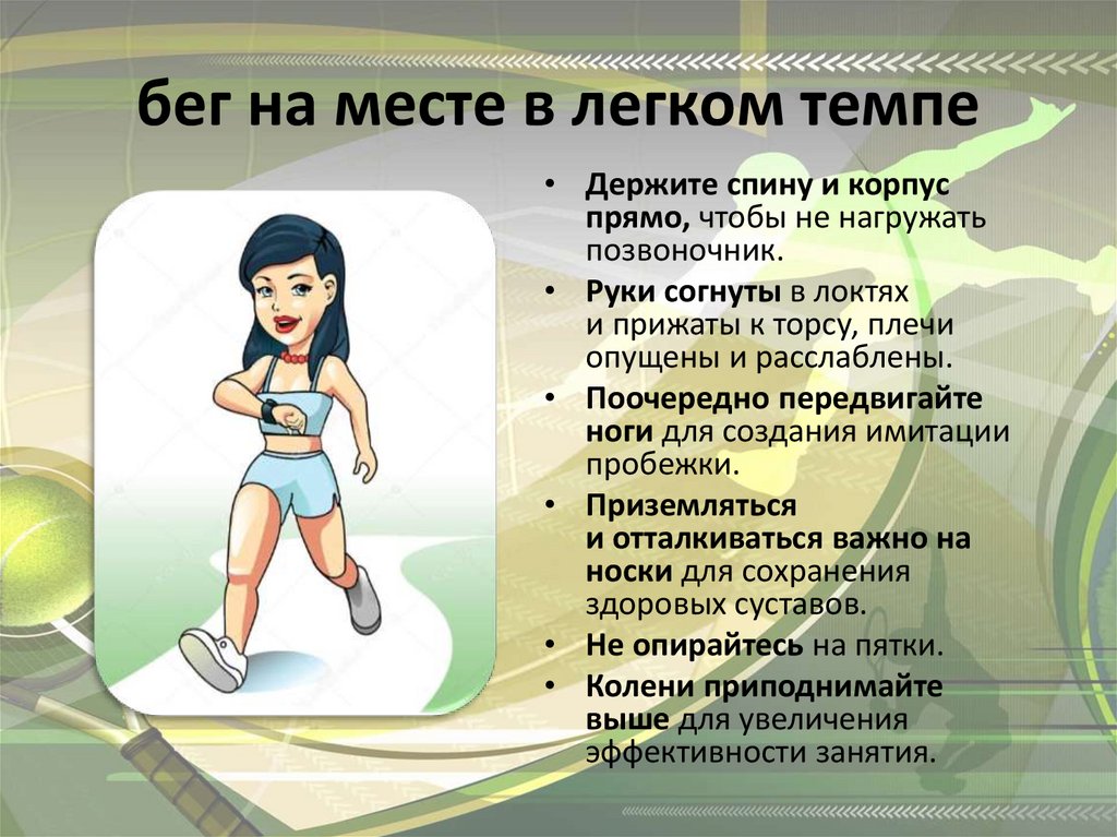 бег на месте в легком темпе• Держите спину и корпус