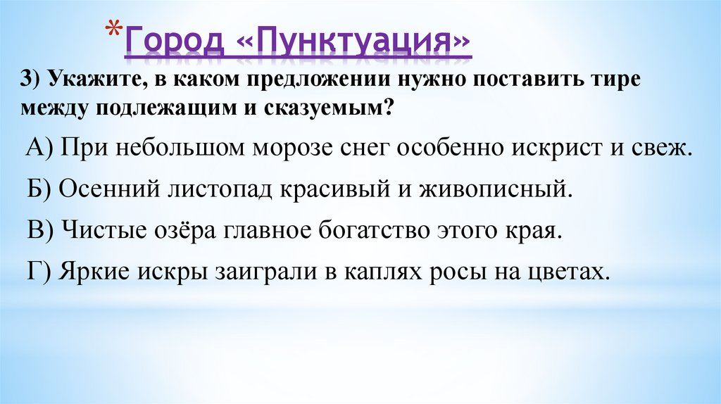 *Город «Пунктуация»3) Укажите, в каком предложении нужно поставить тире