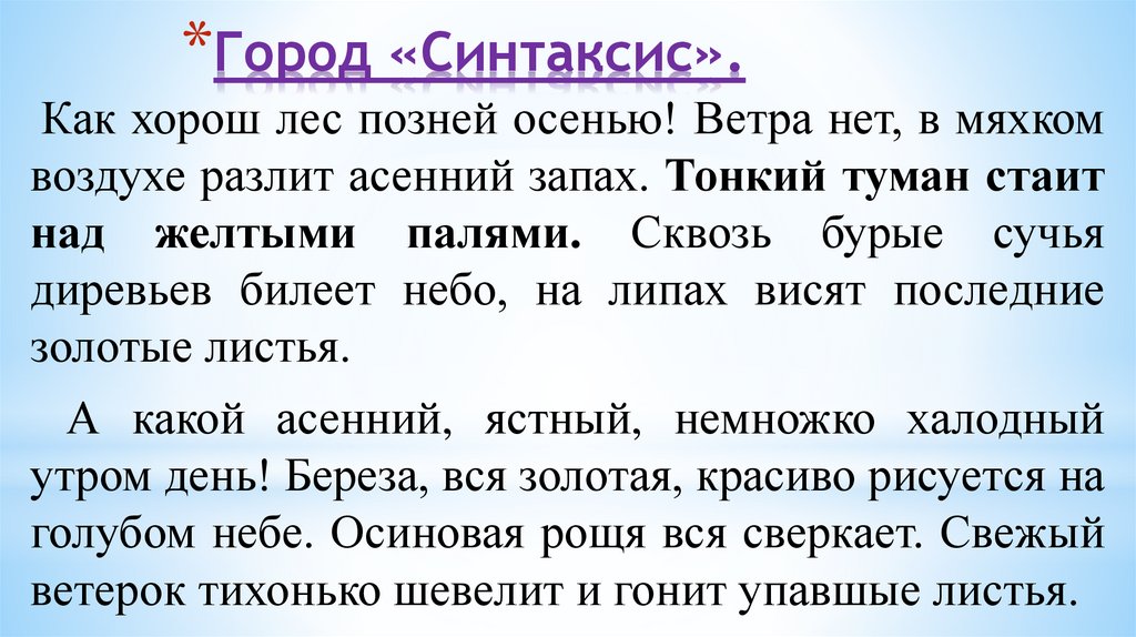 *Город «Синтаксис».Как хорош лес позней осенью! Ветра нет, в мяхком