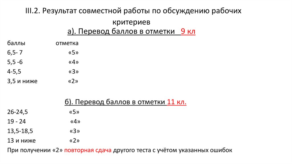 III.2. Результат совместной работы по обсуждению рабочихкритериев