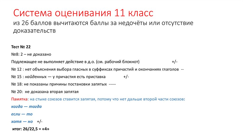 Система оценивания 11 классиз 26 баллов вычитаются баллы за недочёты или отсутствие
