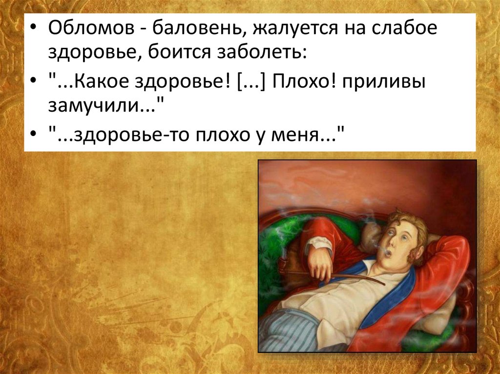 • Обломов - баловень, жалуется на слабоездоровье, боится заболеть: