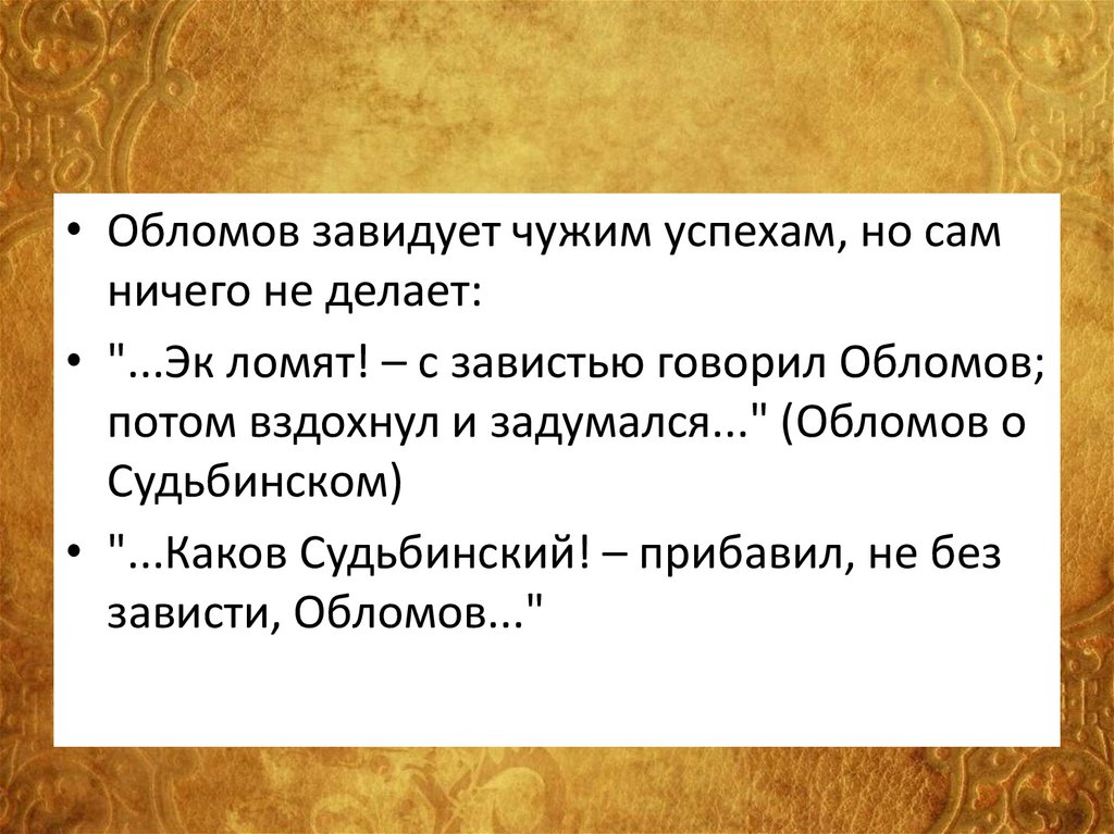 • Обломов завидует чужим успехам, но самничего не делает: