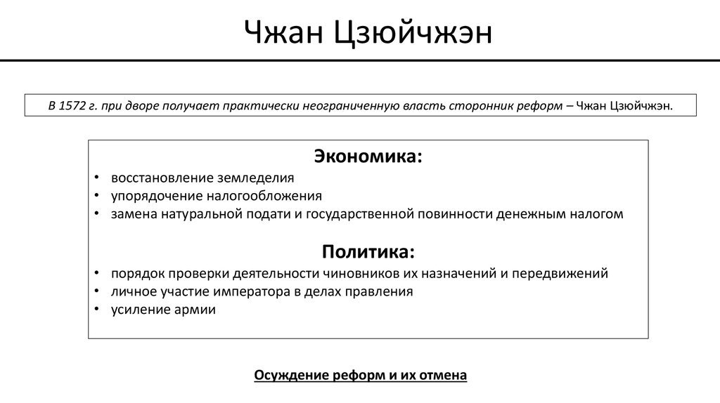 Чжан ЦзюйчжэнВ 1572 г. при дворе получает практически неограниченную власть сторонник реформ – Чжан Цзюйчжэн.