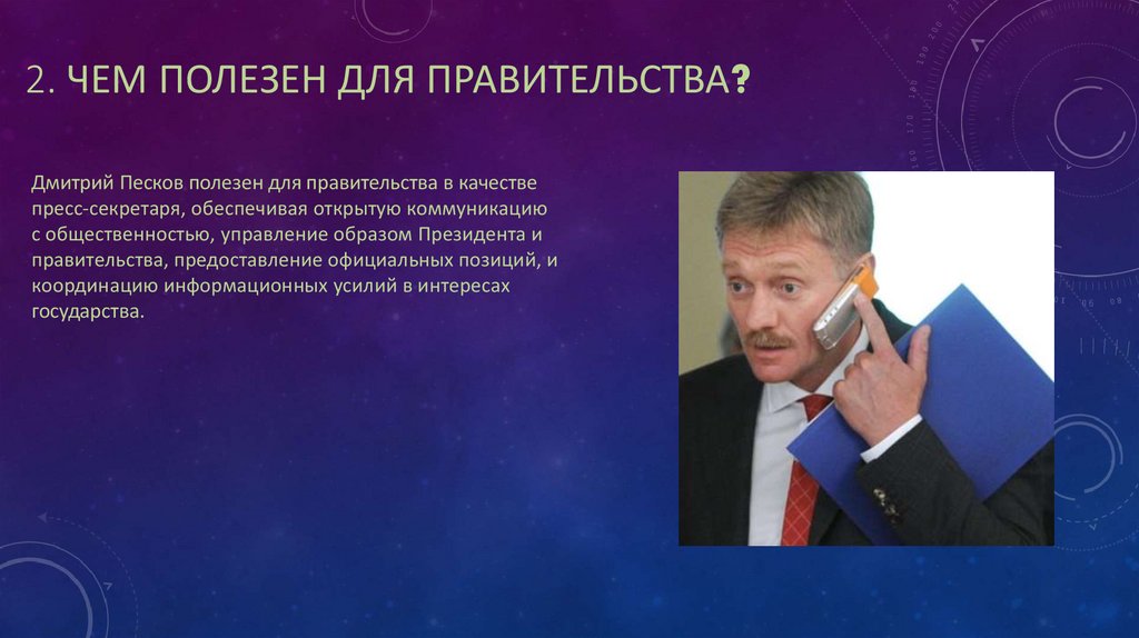 2. ЧЕМ ПОЛЕЗЕН ДЛЯ ПРАВИТЕЛЬСТВА?Дмитрий Песков полезен для правительства в качестве