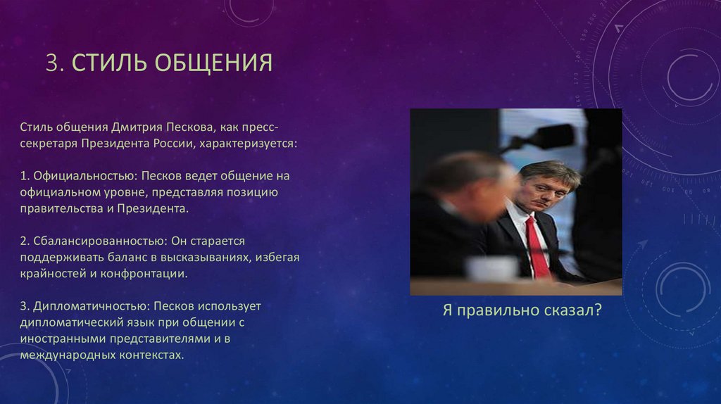 3. СТИЛЬ ОБЩЕНИЯСтиль общения Дмитрия Пескова, как пресссекретаря Президента России, характеризуется: