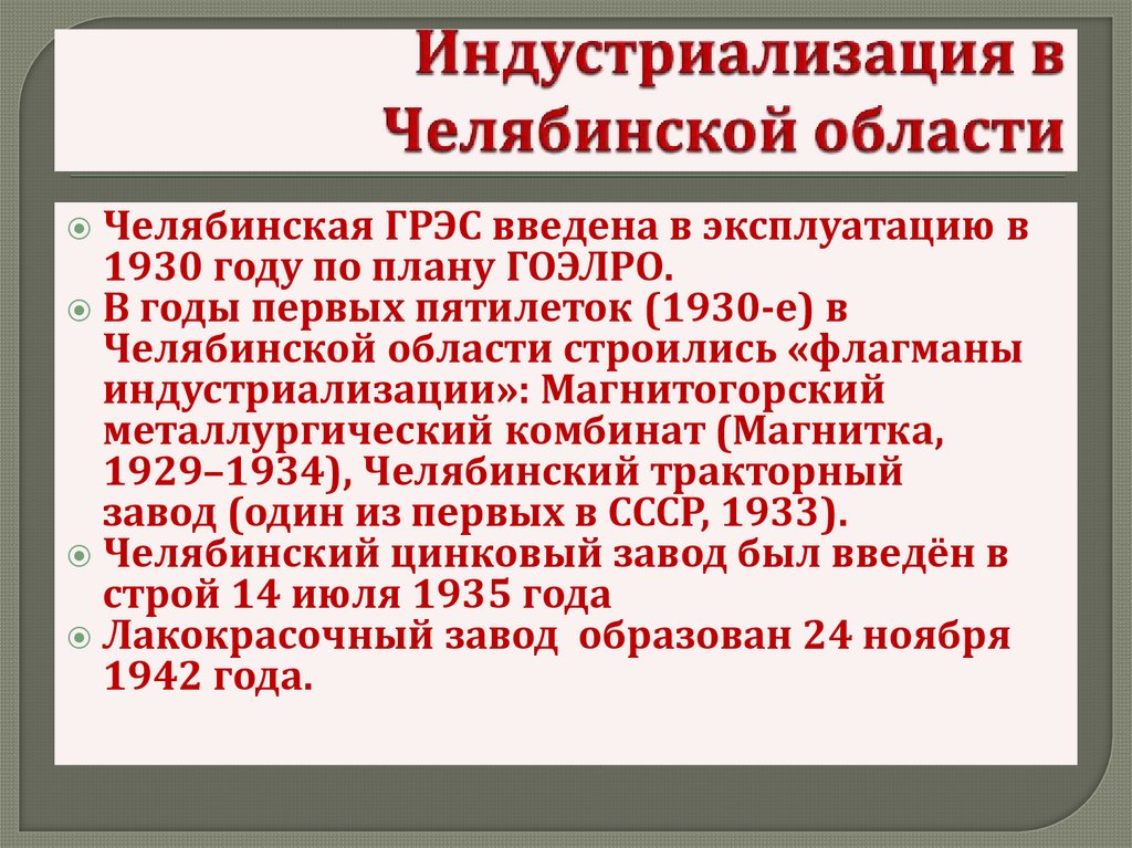 Челябинская ГРЭС введена в эксплуатацию в1930 году по плану ГОЭЛРО.