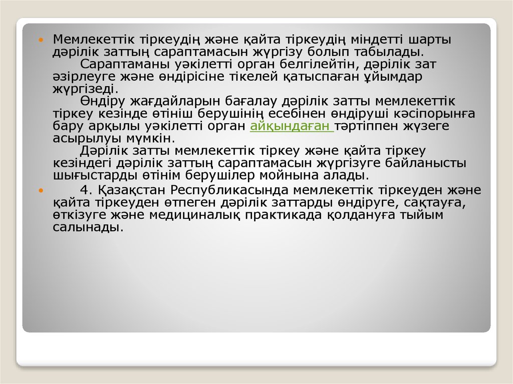 Мемлекеттiк тiркеудiң және қайта тiркеудiң мiндеттi шартыдәрiлiк заттың сараптамасын жүргiзу болып табылады.