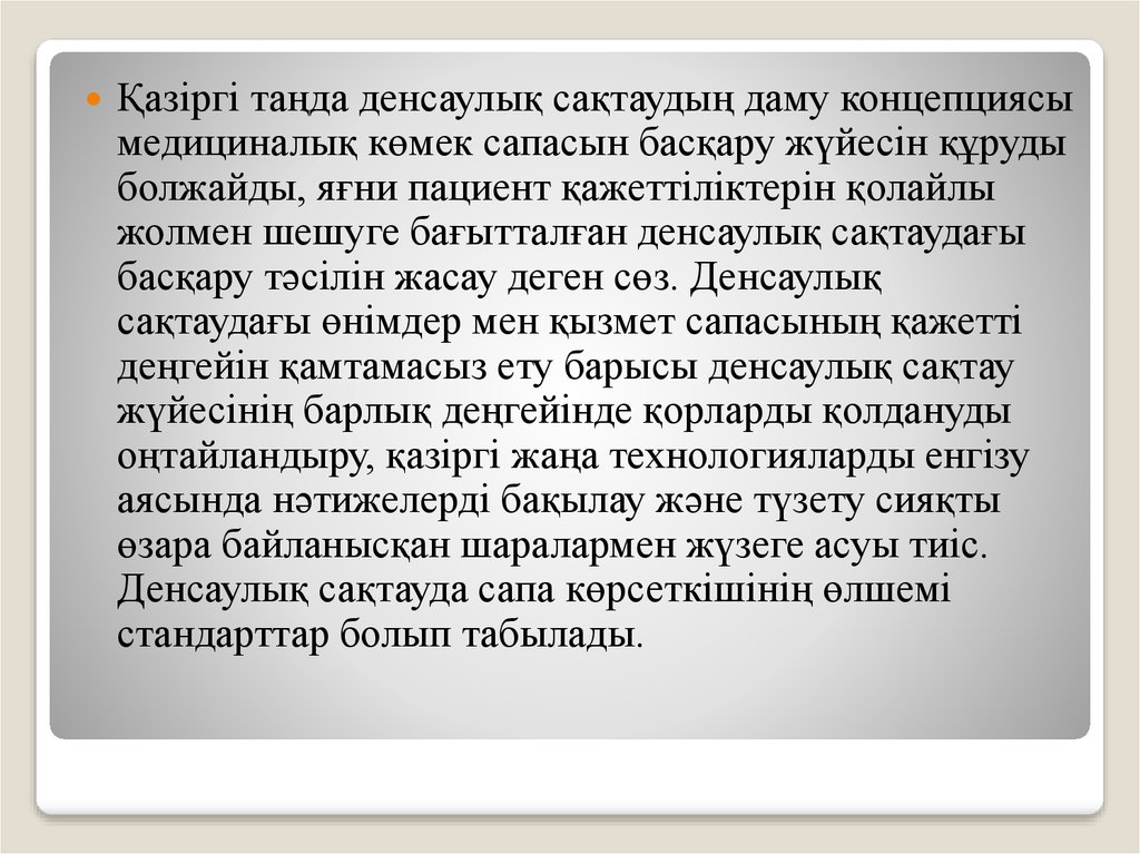 Қазіргі таңда денсаулық сақтаудың даму концепциясымедициналық көмек сапасын басқару жүйесін құруды