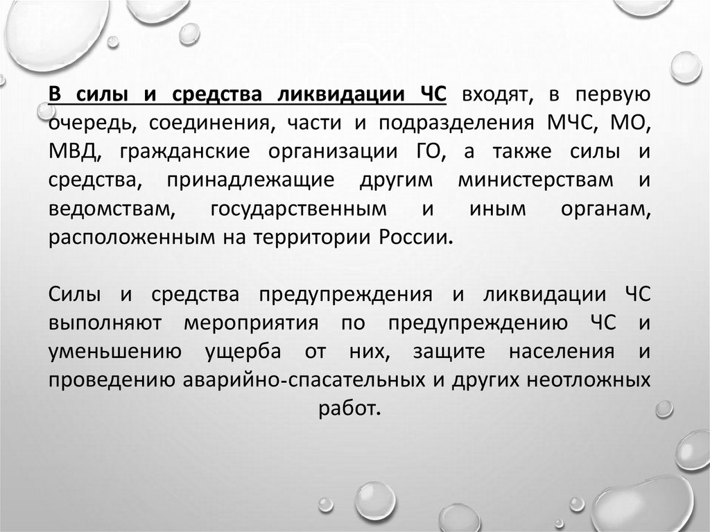 В силы и средства ликвидации ЧС входят, в первуюочередь, соединения, части и подразделения МЧС, МО,