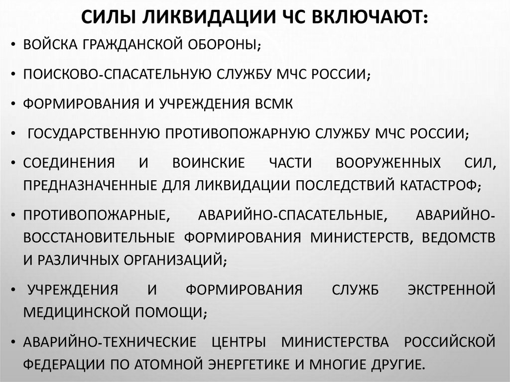 СИЛЫ ЛИКВИДАЦИИ ЧС ВКЛЮЧАЮТ:• ВОЙСКА ГРАЖДАНСКОЙ ОБОРОНЫ;