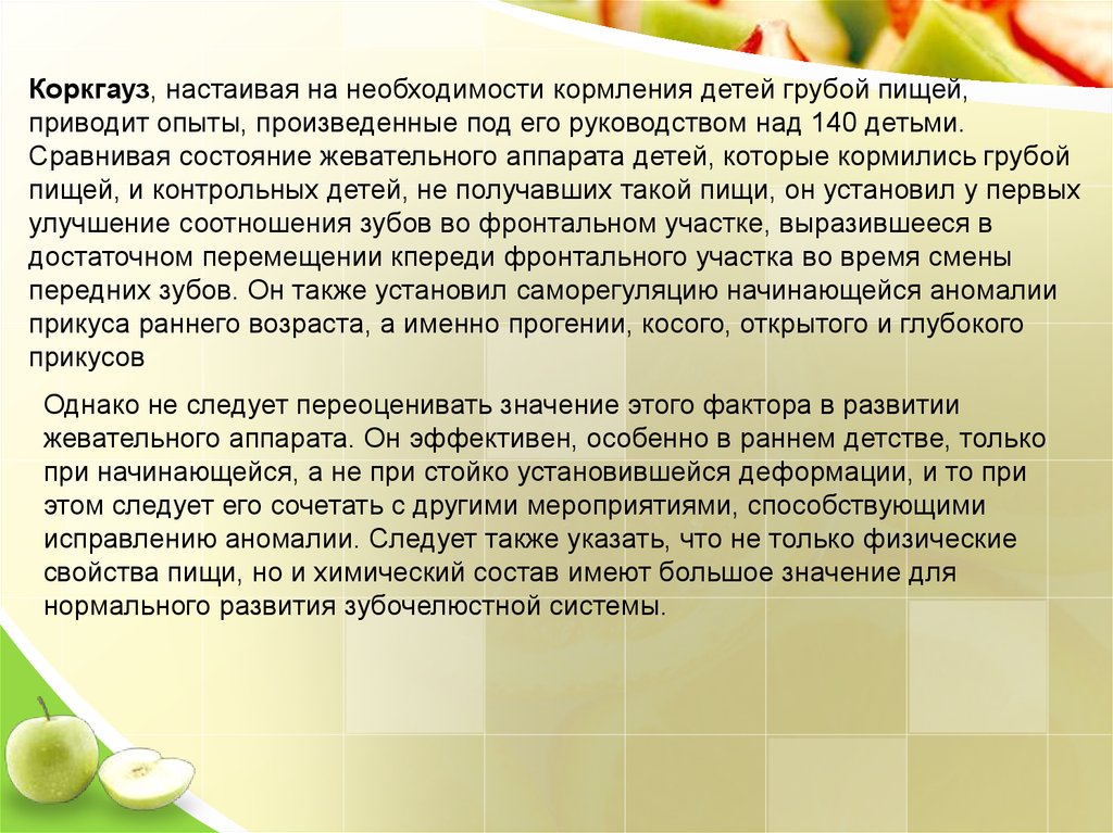 Коркгауз, настаивая на необходимости кормления детей грубой пищей,приводит опыты, произведенные под его руководством над 140 детьми.