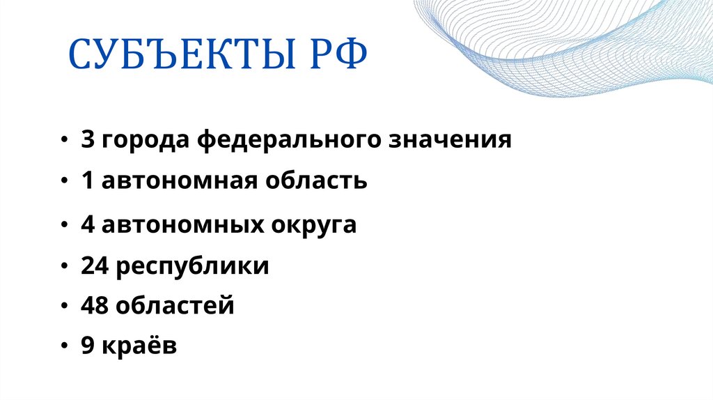 СУБЪЕКТЫ РФ• 3 города федерального значения