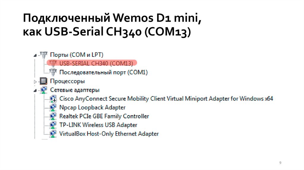 Подключенный Wemos D1 mini,как USB-Serial CH340 (COM13)