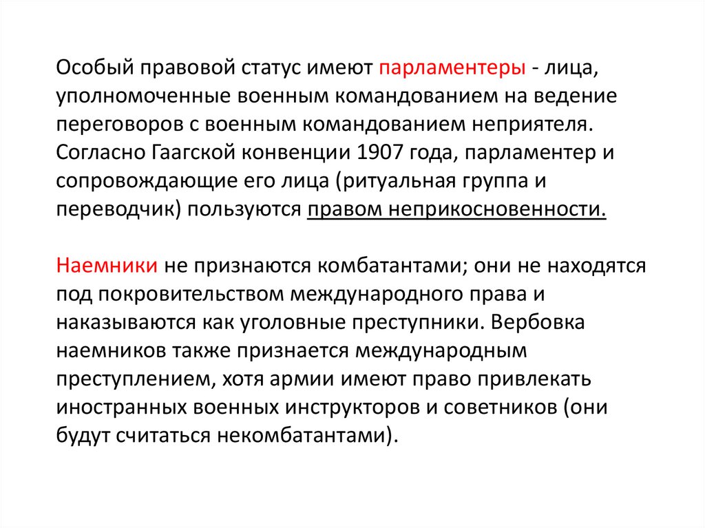 Особый правовой статус имеют парламентеры - лица,уполномоченные военным командованием на ведение