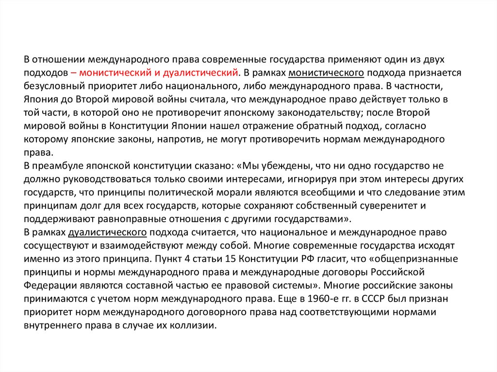 В отношении международного права современные государства применяют один из двухподходов – монистический и дуалистический. В рамках монистического подхода признается