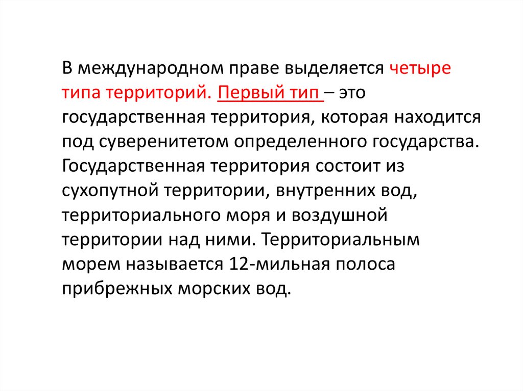 В международном праве выделяется четыретипа территорий. Первый тип – это
