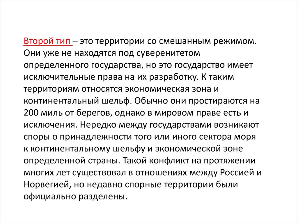 Второй тип – это территории со смешанным режимом.Они уже не находятся под суверенитетом