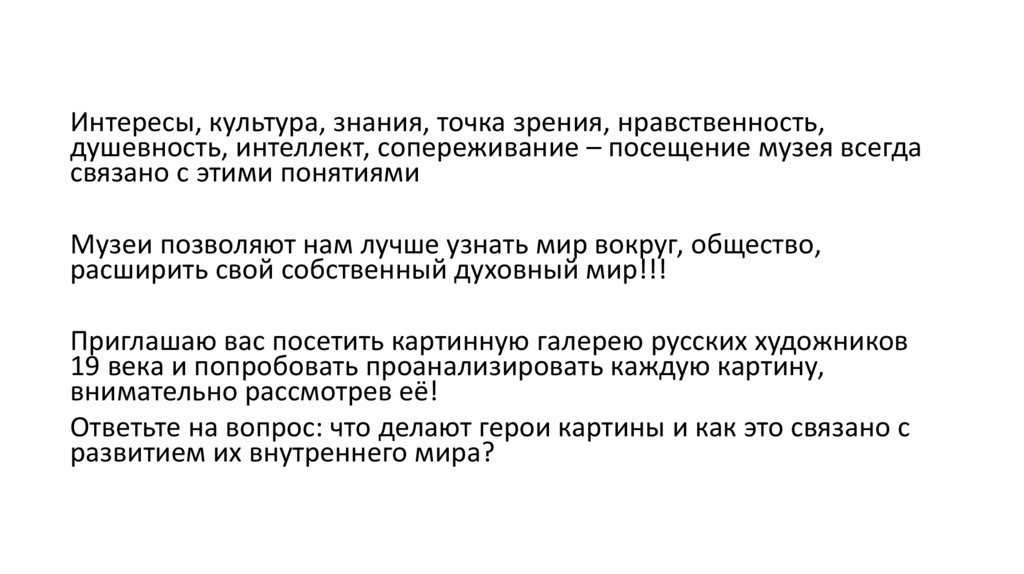 Интересы, культура, знания, точка зрения, нравственность,душевность, интеллект, сопереживание – посещение музея всегда