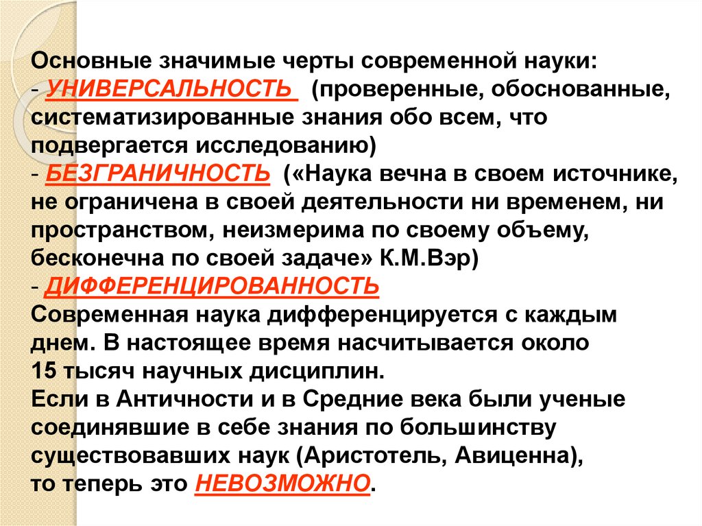 Основные значимые черты современной науки:- УНИВЕРСАЛЬНОСТЬ (проверенные, обоснованные,