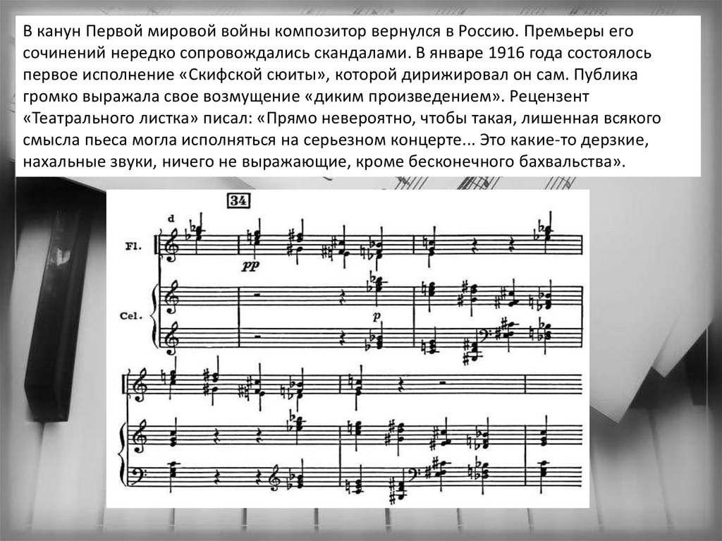 В канун Первой мировой войны композитор вернулся в Россию. Премьеры егосочинений нередко сопровождались скандалами. В январе 1916 года состоялось