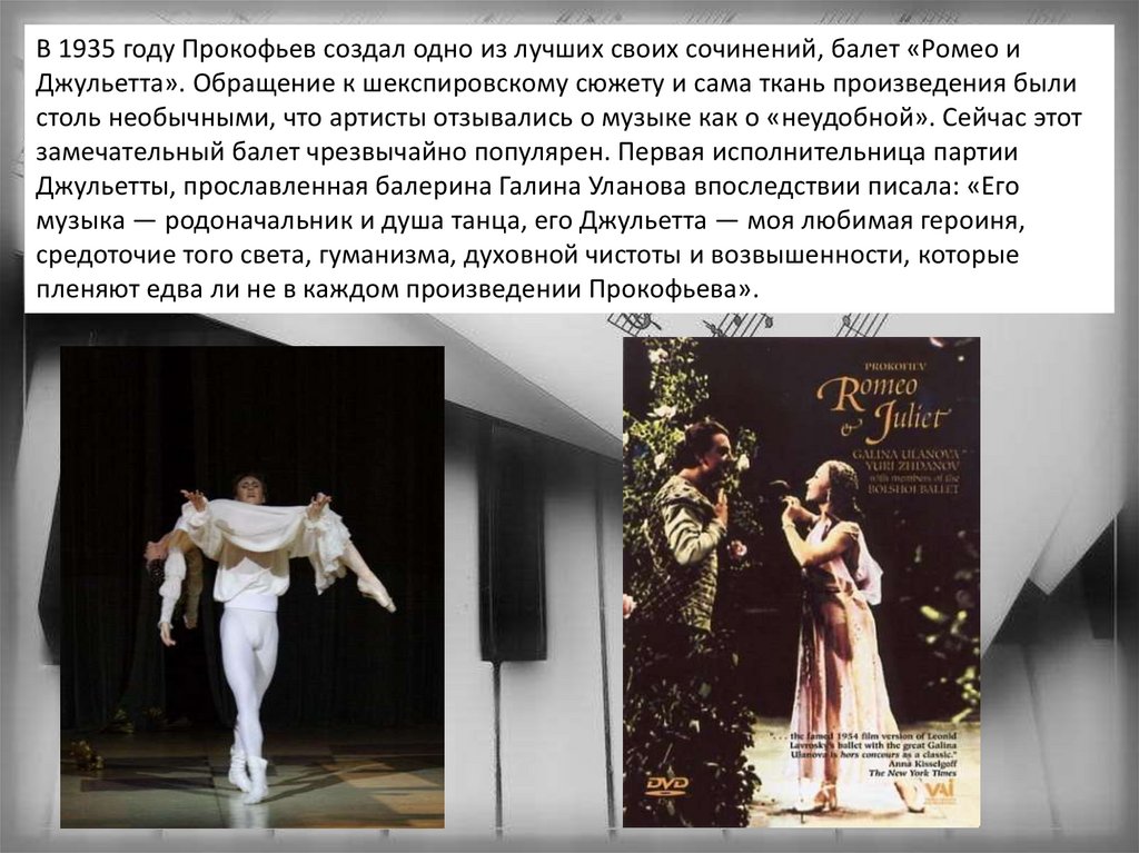 В 1935 году Прокофьев создал одно из лучших своих сочинений, балет «Ромео иДжульетта». Обращение к шекспировскому сюжету и сама ткань произведения были