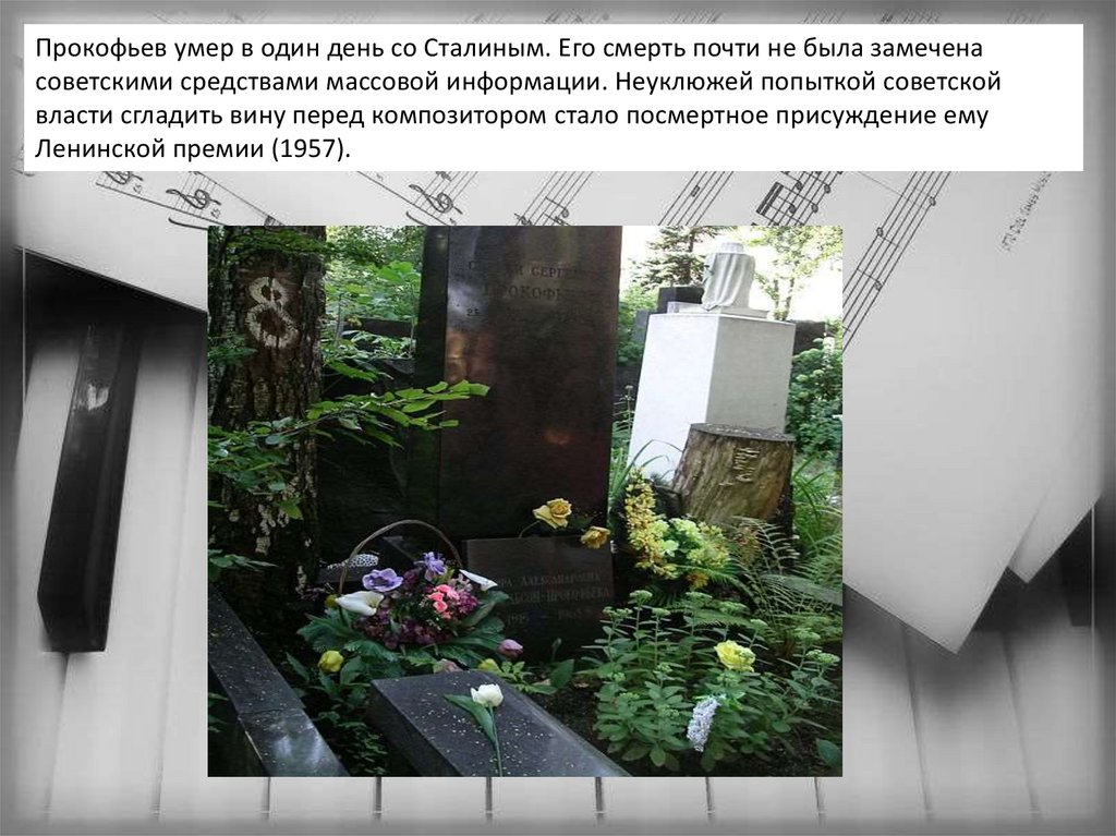 Прокофьев умер в один день со Сталиным. Его смерть почти не была замеченасоветскими средствами массовой информации. Неуклюжей попыткой советской