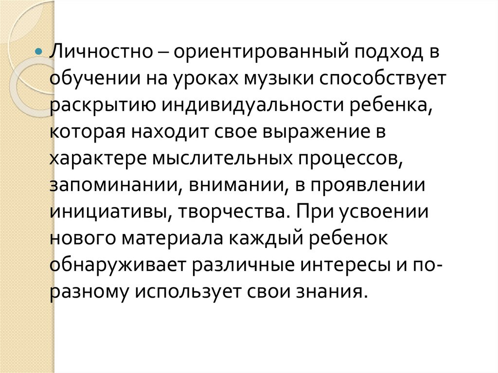 Личностно – ориентированный подход вобучении на уроках музыки способствует