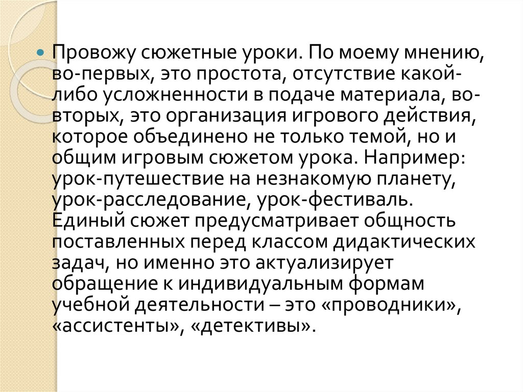 Провожу сюжетные уроки. По моему мнению,во-первых, это простота, отсутствие какойлибо усложненности в подаче материала, вовторых, это организация игрового действия,