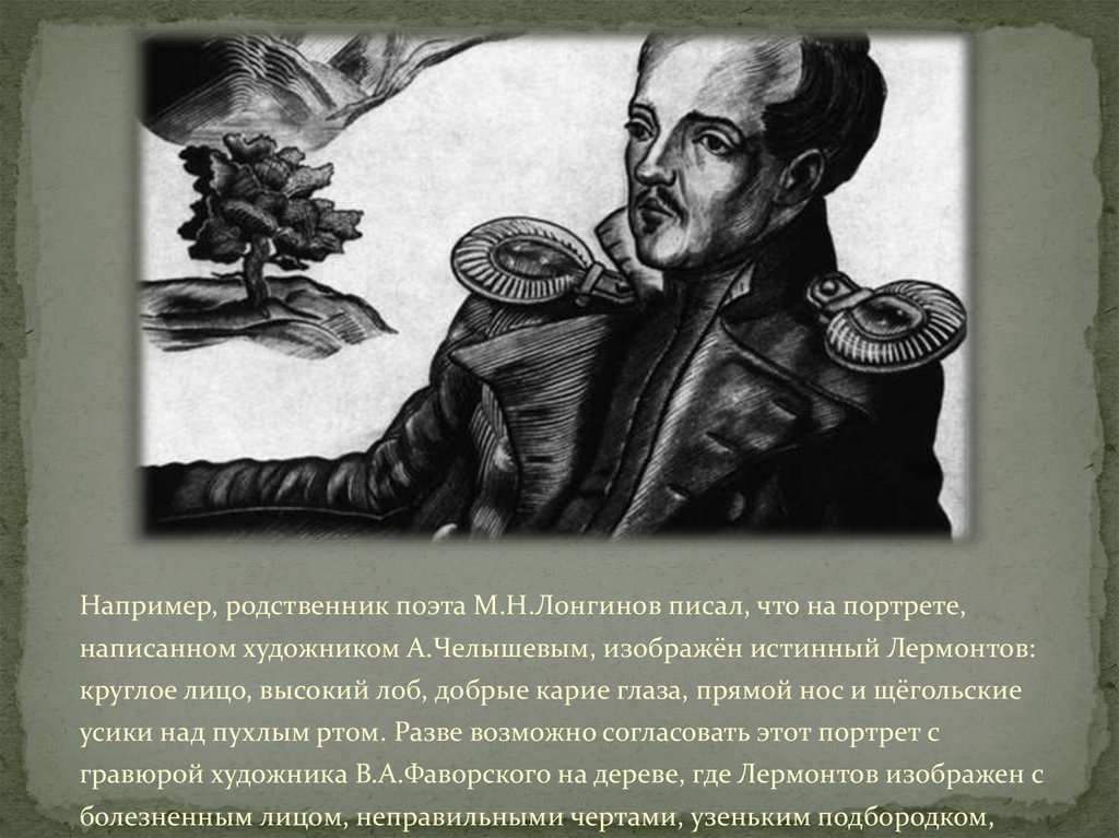 Например, родственник поэта М.Н.Лонгинов писал, что на портрете,написанном художником А.Челышевым, изображён истинный Лермонтов: