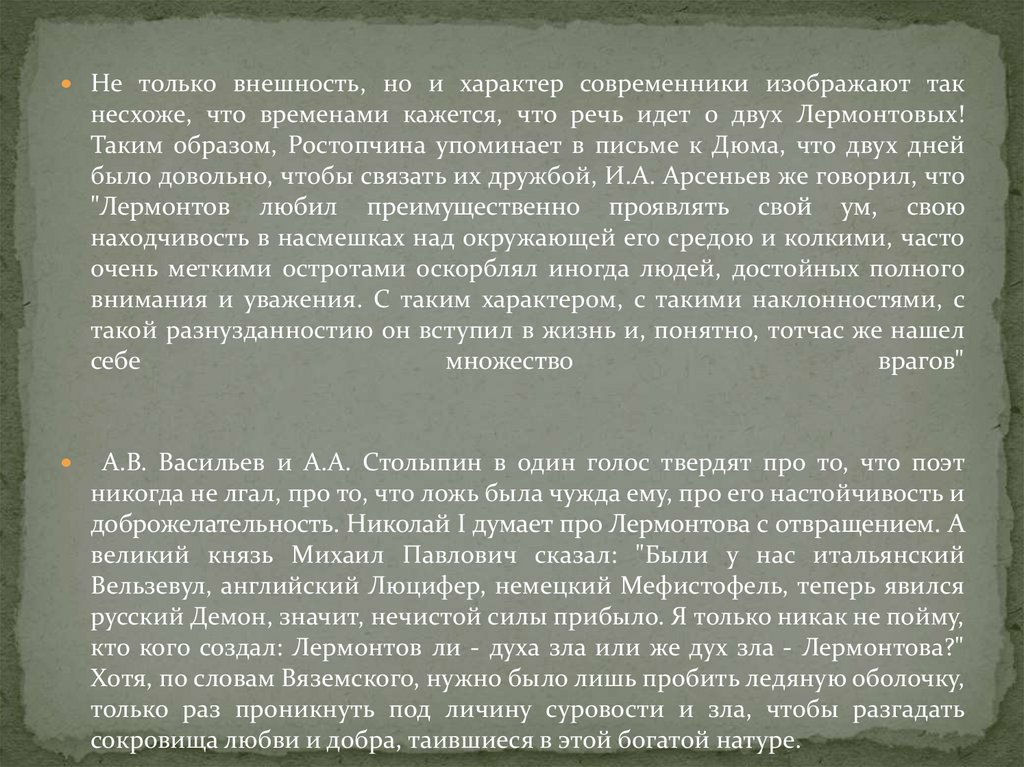 В воспоминаниях современников не существует единого образаЛермонтова. Некоторые характеризуют его как человека злого,