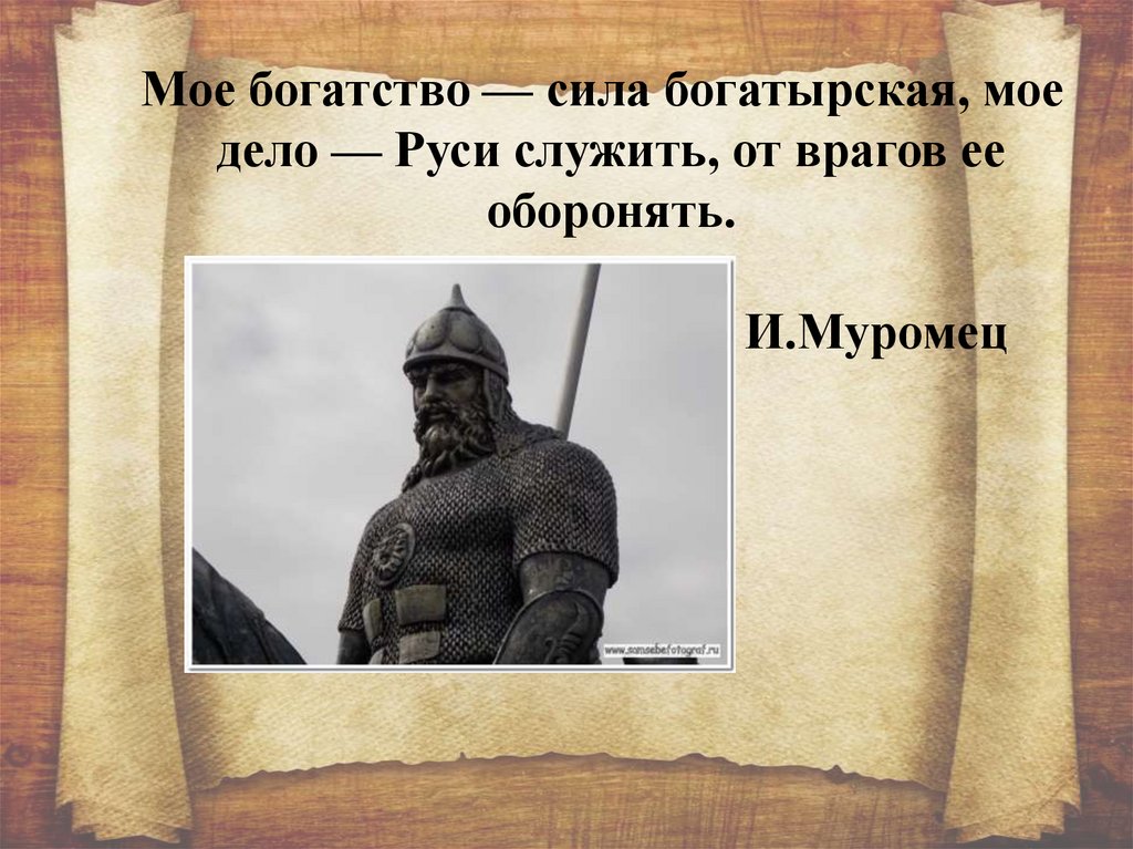 Мое богатство — сила богатырская, моедело — Руси служить, от врагов ее