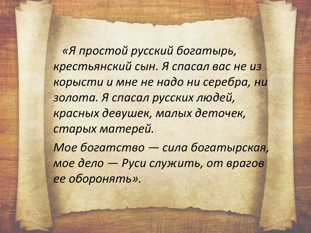 «Я простой русский богатырь,крестьянский сын. Я спасал вас не из