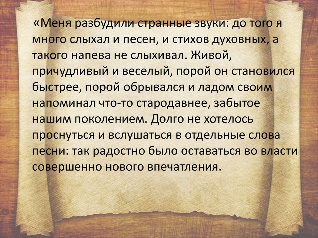 «Меня разбудили странные звуки: до того ямного слыхал и песен, и стихов духовных, а