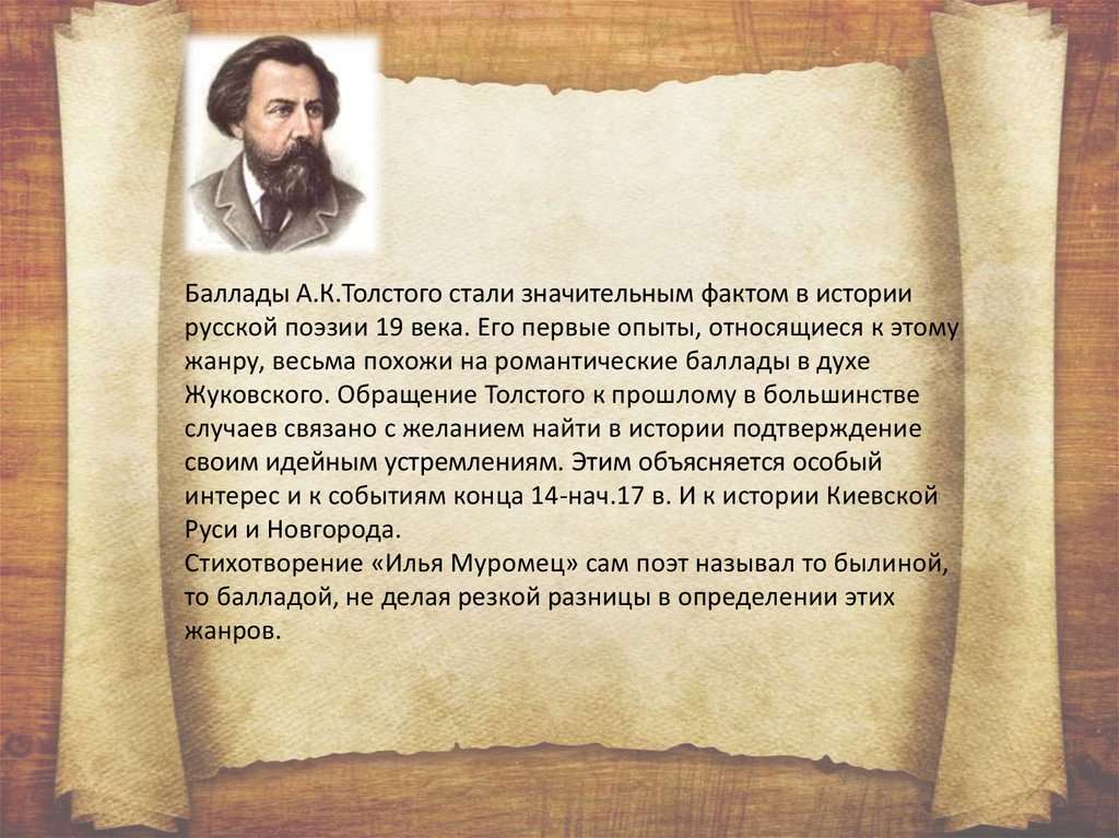 Баллады А.К.Толстого стали значительным фактом в историирусской поэзии 19 века. Его первые опыты, относящиеся к этому
