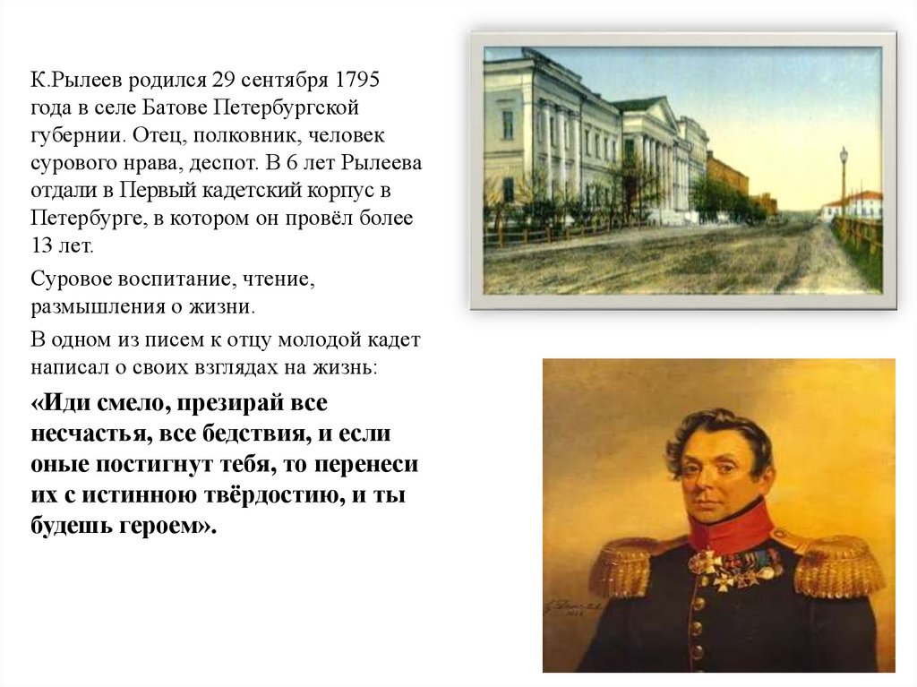 К.Рылеев родился 29 сентября 1795года в селе Батове Петербургской