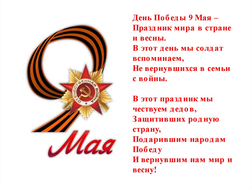 День Поб ед ы 9 Мая –Празд ник мира в стране