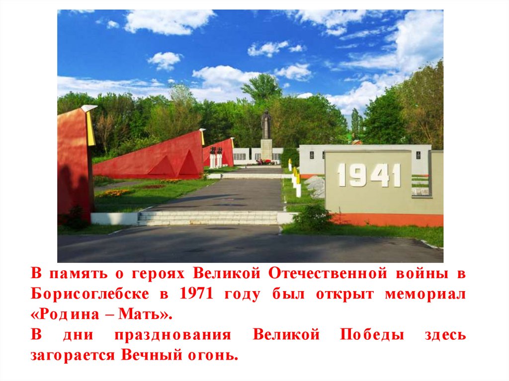 В память о героях Великой Отечественной войны вБорисоглебске в 1971 году был открыт мемориал
