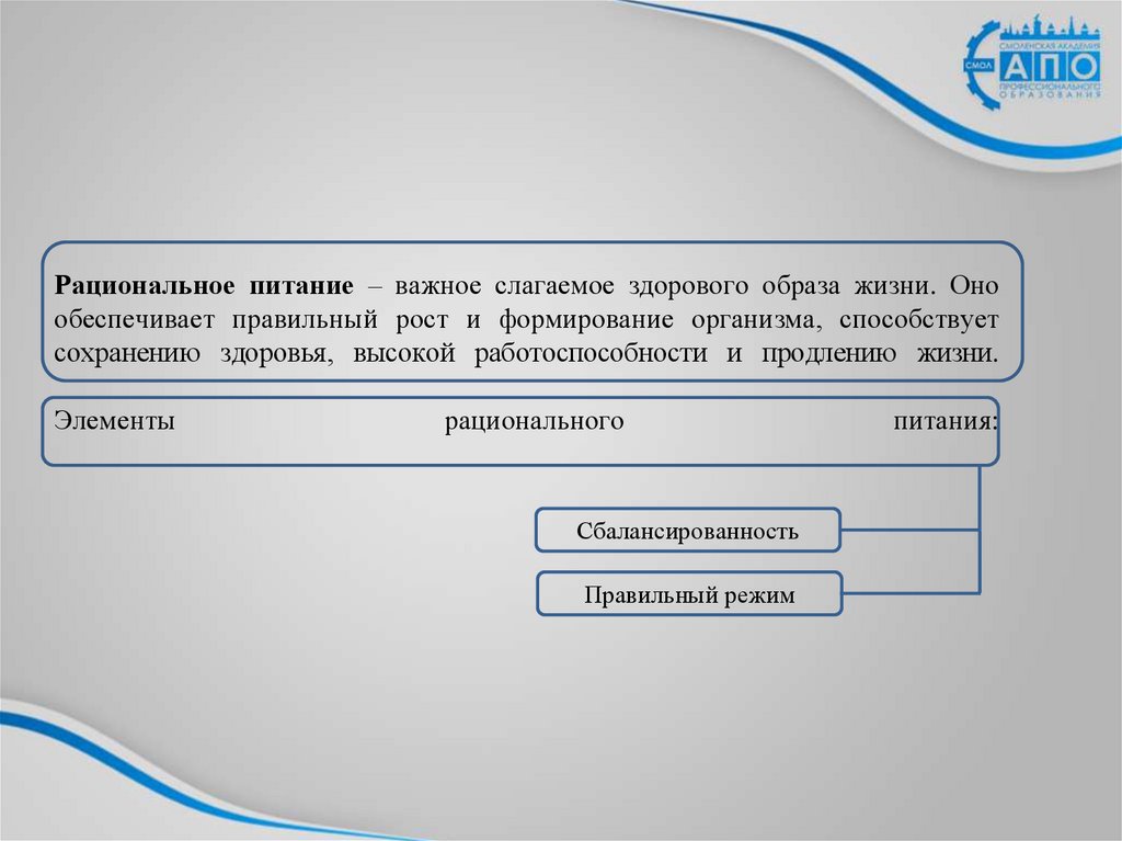 Рациональное питание – важное слагаемое здорового образа жизни. Онообеспечивает правильный рост и формирование организма, способствует