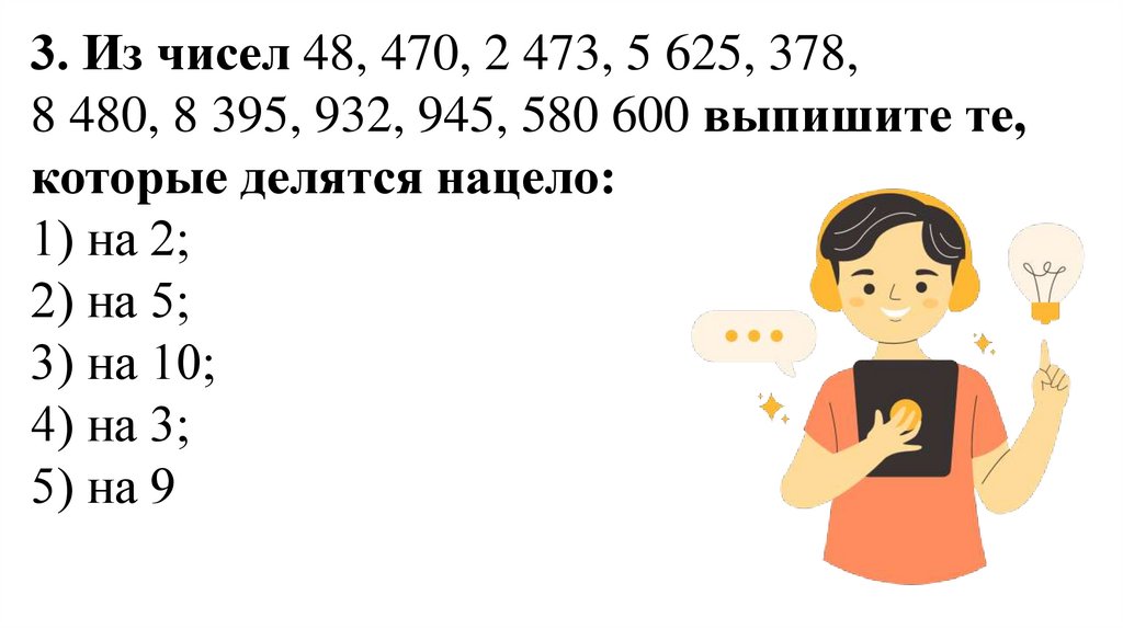 3. Из чисел 48, 470, 2 473, 5 625, 378,8 480, 8 395, 932, 945, 580 600 выпишите те,