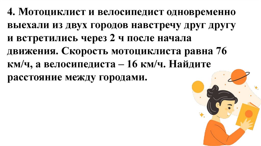 4. Мотоциклист и велосипедист одновременновыехали из двух городов навстречу друг другу