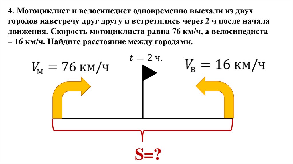4. Мотоциклист и велосипедист одновременно выехали из двухгородов навстречу друг другу и встретились через 2 ч после начала