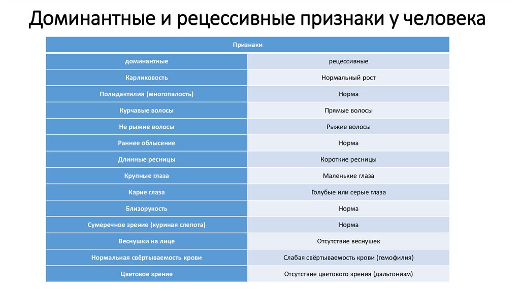 Доминантные и рецессивные признаки у человекаПризнаки