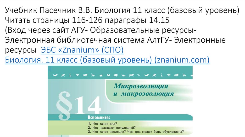 Учебник Пасечник В.В. Биология 11 класс (базовый уровень)Читать страницы 116-126 параграфы 14,15