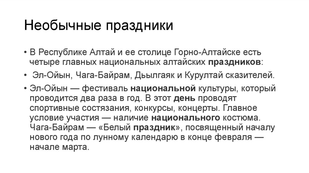 Необычные праздники• В Республике Алтай и ее столице Горно-Алтайске есть