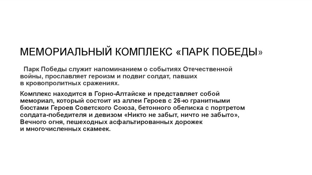 МЕМОРИАЛЬНЫЙ КОМПЛЕКС «ПАРК ПОБЕДЫ»Парк Победы служит напоминанием о событиях Отечественной