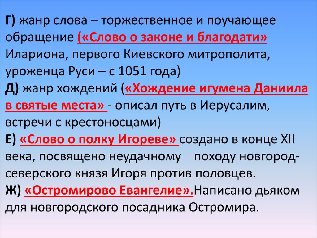 Г) жанр слова – торжественное и поучающееобращение («Слово о законе и благодати»