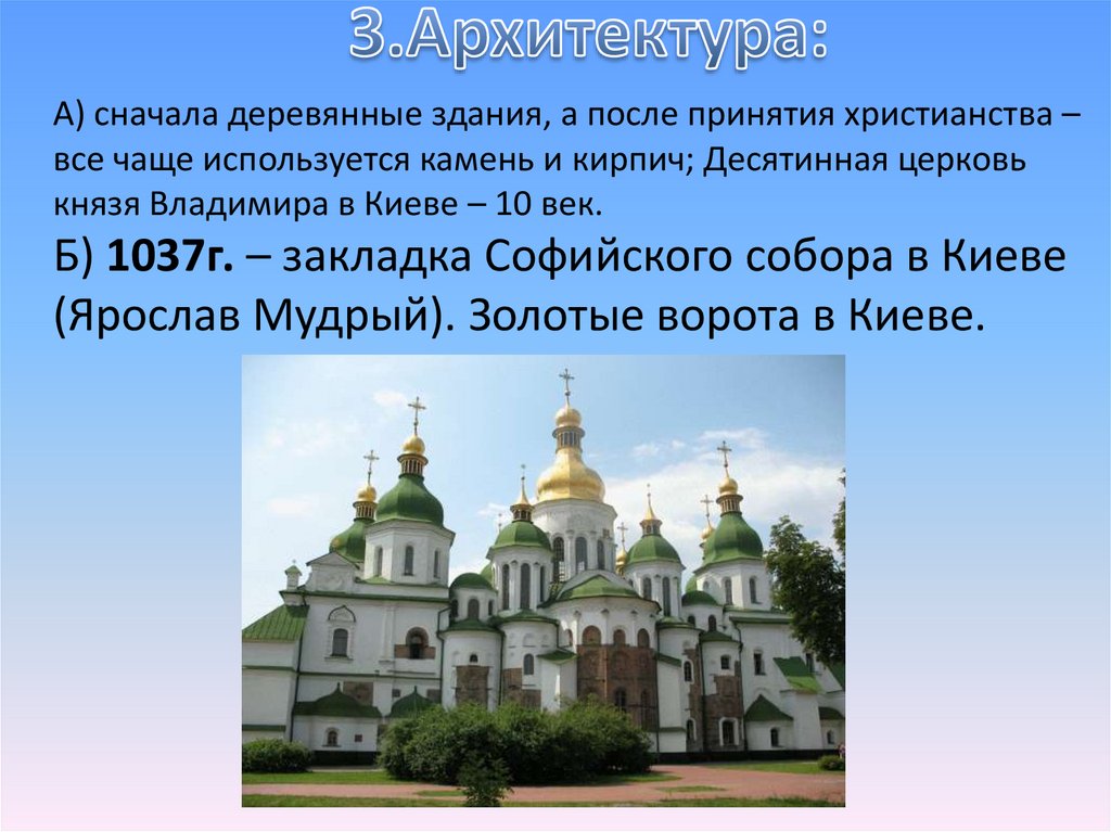 А) сначала деревянные здания, а после принятия христианства –все чаще используется камень и кирпич; Десятинная церковь