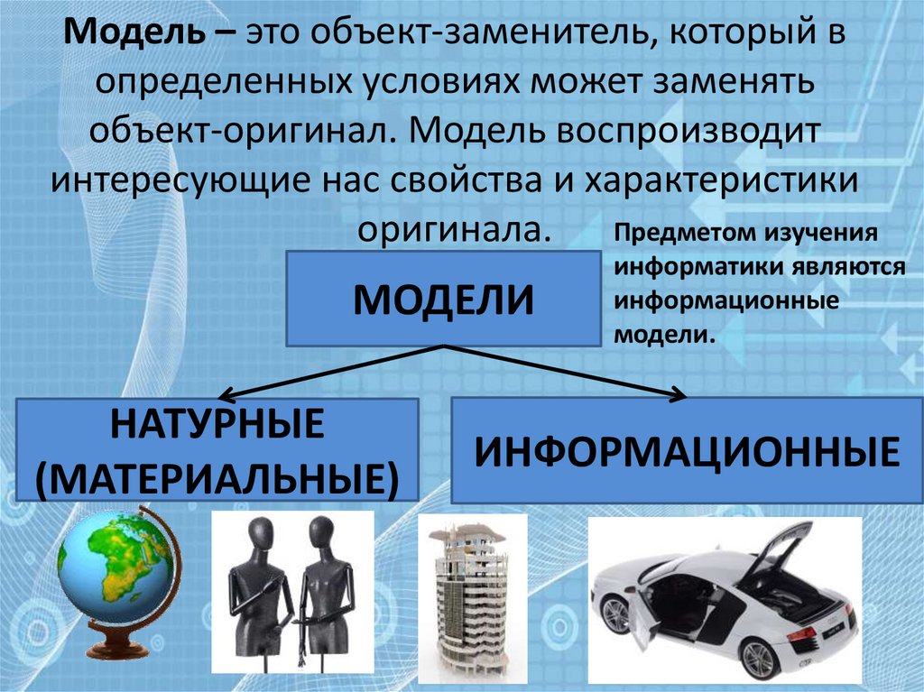 Модель – это объект-заменитель, который вопределенных условиях может заменять