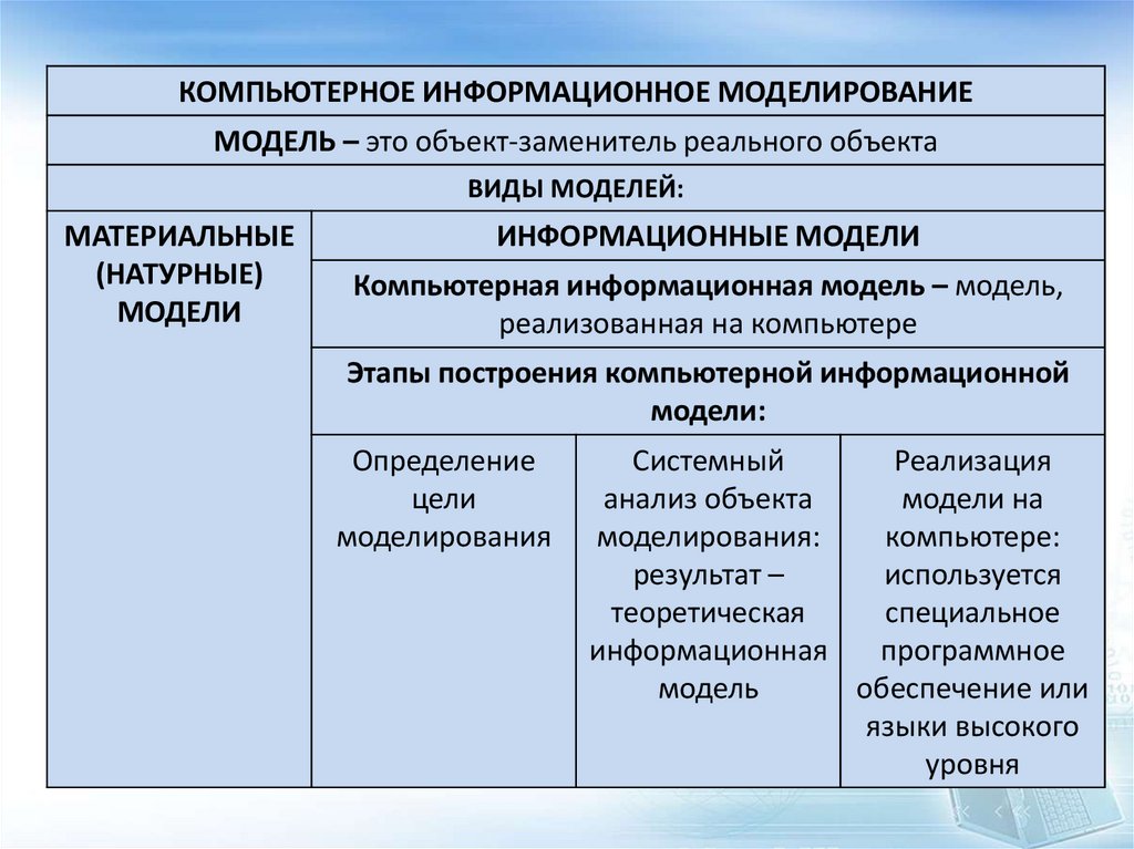 КОМПЬЮТЕРНОЕ ИНФОРМАЦИОННОЕ МОДЕЛИРОВАНИЕМОДЕЛЬ – это объект-заменитель реального объекта